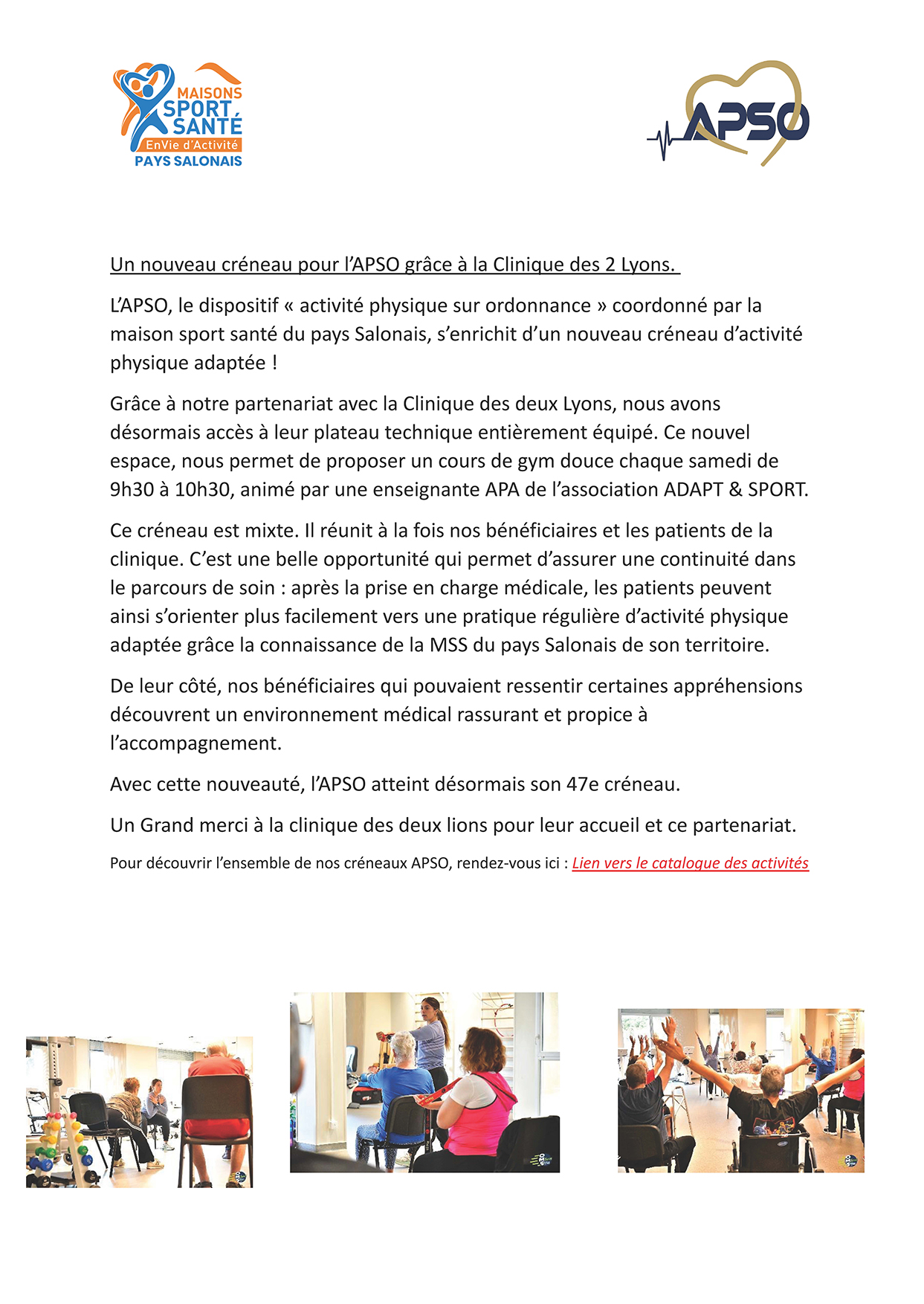 Dans sa mission de construction d’un maillage territorial et d’orientation vers une offre adaptée, la Maison Sport Santé du Pays Salonais a développé un partenariat avec la clinique des Deux Lions.
